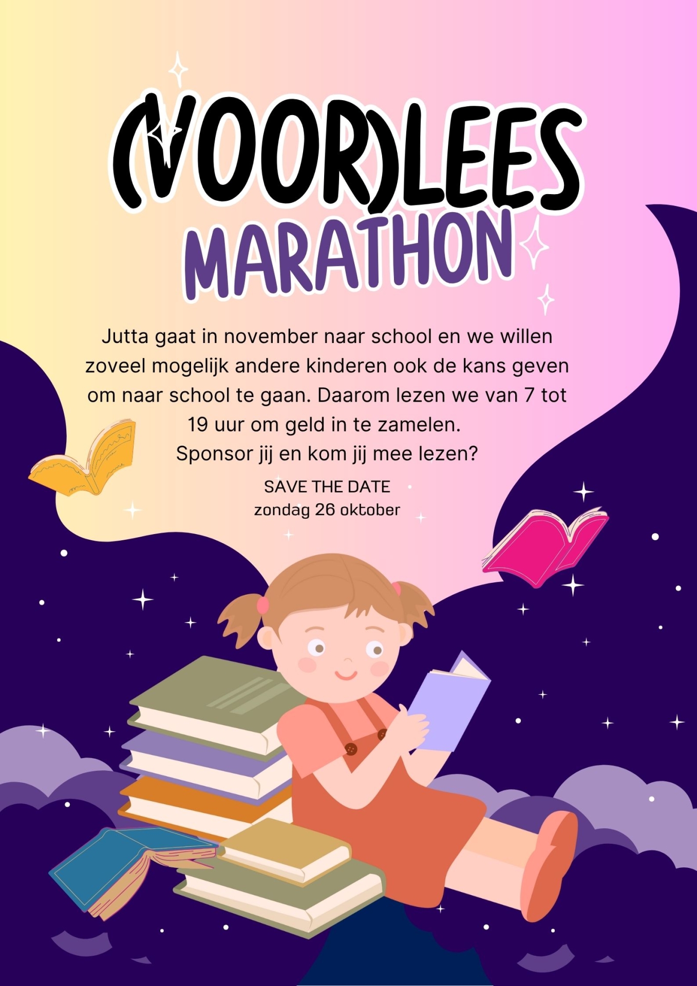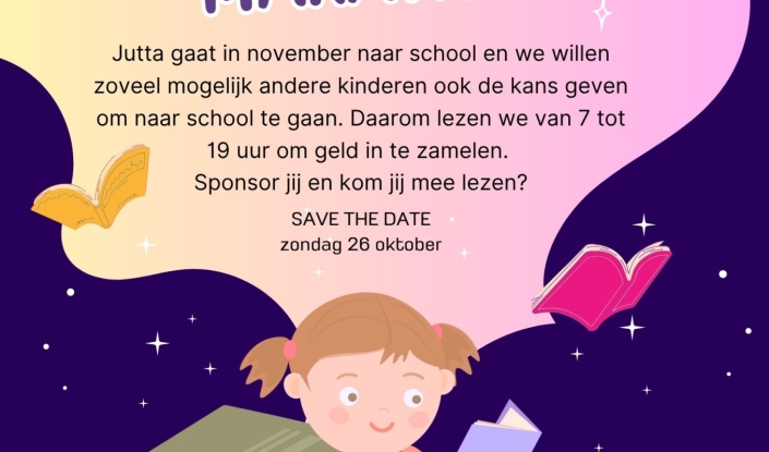 Jutta gaat in november voor het eerst naar school. In plaats van een groeifeest te geven enkel voor haar, organiseren we een (voor)leesmarathon om geld in te zamelen voor het goede doel. Want dat Jutta naar school kan gaan, is hier misschien evident, maar lang niet overal in de wereld!